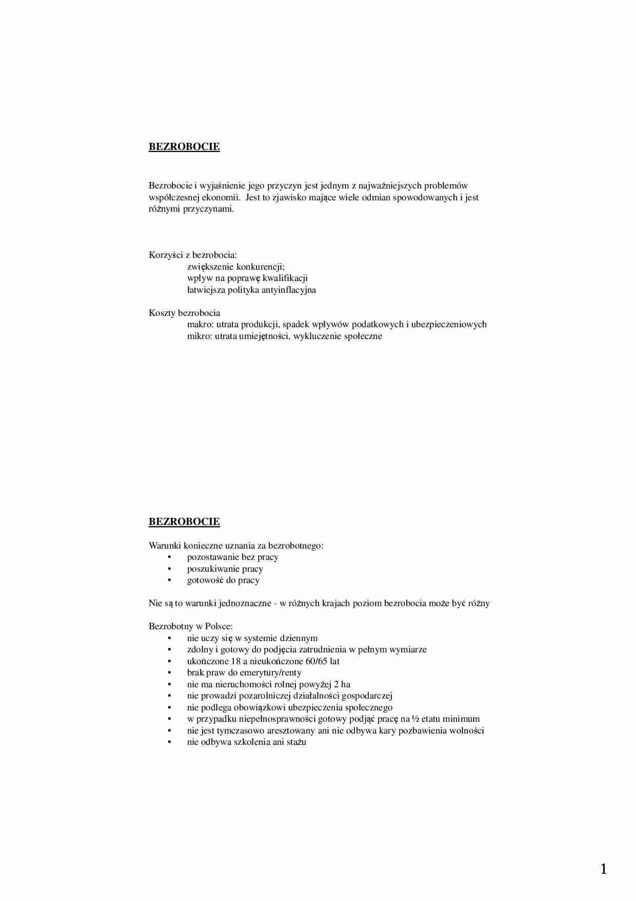 1 81 BEZROBOCIE Bezrobocie i wyjaśnienie jego przyczyn jest jednym z najwaŜniejszych problemów współczesnej ekonomii. Jest to zjawisko mające wiele odmian spowodowanych i jest róŜnymi przyczynami. Korzyści z bezrobocia: zwiększenie konkurencji; wpływ na poprawę kwalifikacji łatwiejsza polityka antyinflacyjna Koszty bezrobocia makro: utrata produkcji, spadek wpływów podatkowych i ubezpieczeniowych mikro: utrata umiejętności, wykluczenie społeczne 82 BEZROBOCIE Warunki konieczne uznania za bezrobotnego: • pozostawanie bez pracy • poszukiwanie pracy • gotowość do pracy Nie są to warunki jednoznaczne - w róŜnych krajach poziom bezrobocia moŜe być róŜny Bezrobotny w Polsce: • nie uczy się w systemie dziennym • zdolny i gotowy do podjęcia zatrudnienia w pełnym wymiarze • ukończone 18 a nieukończone 60/65 lat • brak praw do emerytury/renty • nie ma nieruchomości rolnej powyŜej 2 ha • nie prowadzi pozarolniczej działalności gospodarczej • nie podlega obowiązkowi ubezpieczenia społecznego • w przypadku niepełnosprawności gotowy podjąć pracę na ½ etatu minimum • nie jest tymczasowo aresztowany ani nie odbywa kary pozbawienia wolności • nie odbywa szkolenia ani staŜu 2 83 BEZROBOCIE W USA - metoda cotygodniowych badań ankietowych bezrobotny: nie wykonywał pracy przynoszącej dochód, nie miał zamówień, aktywnie szukał pracy; W Polsce: • obliczanie bezrobotnych przez rejestrację w Urzędach Pracy; • metoda BAEL od 1992/1999 (badań aktywności ekonomicznej ludności): bezrobotny: nie pracował zarobkowo ani godziny, nie miał zamówień, aktywnie szukał pracy, był gotowy do jej podjęcia Badania ankietowe są standaryzowane (rekomendacje MOP) i umoŜliwiają porównania międzynarodowe 84 BEZROBOCIE Poziom bezrobocia kształtuje relacja podaŜy i popytu na pracę: • jeŜeli krańcowa wydajność pracy jest wyŜsza niŜ płaca realna to występuje tendencja do wzrostu zatrudnienia Stopa bezrobocia: relacja liczby bezrobotnych do zasobów siły roboczej (bezrobotni + pracujący) Rodzaje bezrobocia: jawne – rejestrowane ukryte – wynikające z cech systemu gospodarczego 3 85 BEZROBOCIE Rodzaje bezrobocia jawnego: • frykcyjne – wynika z dynamiki rynków pracy gdzie zajmowanie nowych miejsc nie jest natychmiastowe • strukturalne : niedopasowanie struktury podaŜy do struktury popytu • klasyczne: wynikające ze sztywności systemu płacowego • wynikające z niedostatecznego popytu: osłabienia ogólnej aktywności gospodarczej 86