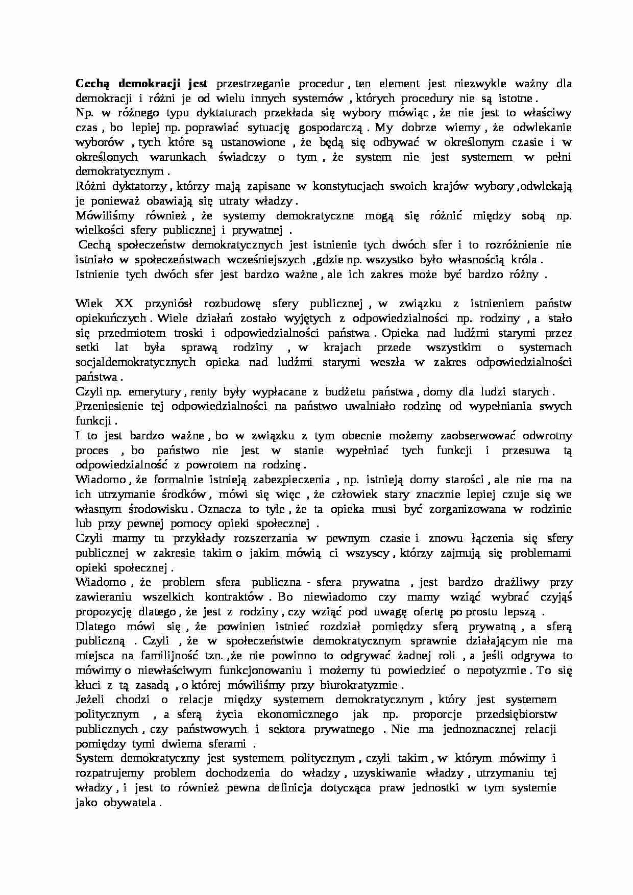 Np. w różnego typu dyktaturach przekłada się wybory mówiąc , że nie jest to właściwy czas , bo lepiej np. poprawiać sytuację gospodarczą . My dobrze wiemy , że odwlekanie wyborów , tych które są ustanowione , że będą się odbywać w określonym czasie i w określonych warunkach świadczy o tym , że system nie jest systemem w pełni demokratycznym . Różni dyktatorzy , którzy mają zapisane w konstytucjach swoich krajów wybory ,odwlekają je ponieważ obawiają się utraty władzy . Mówiliśmy również , że systemy demokratyczne mogą się różnić między sobą np. wielkości sfery publicznej i prywatnej .