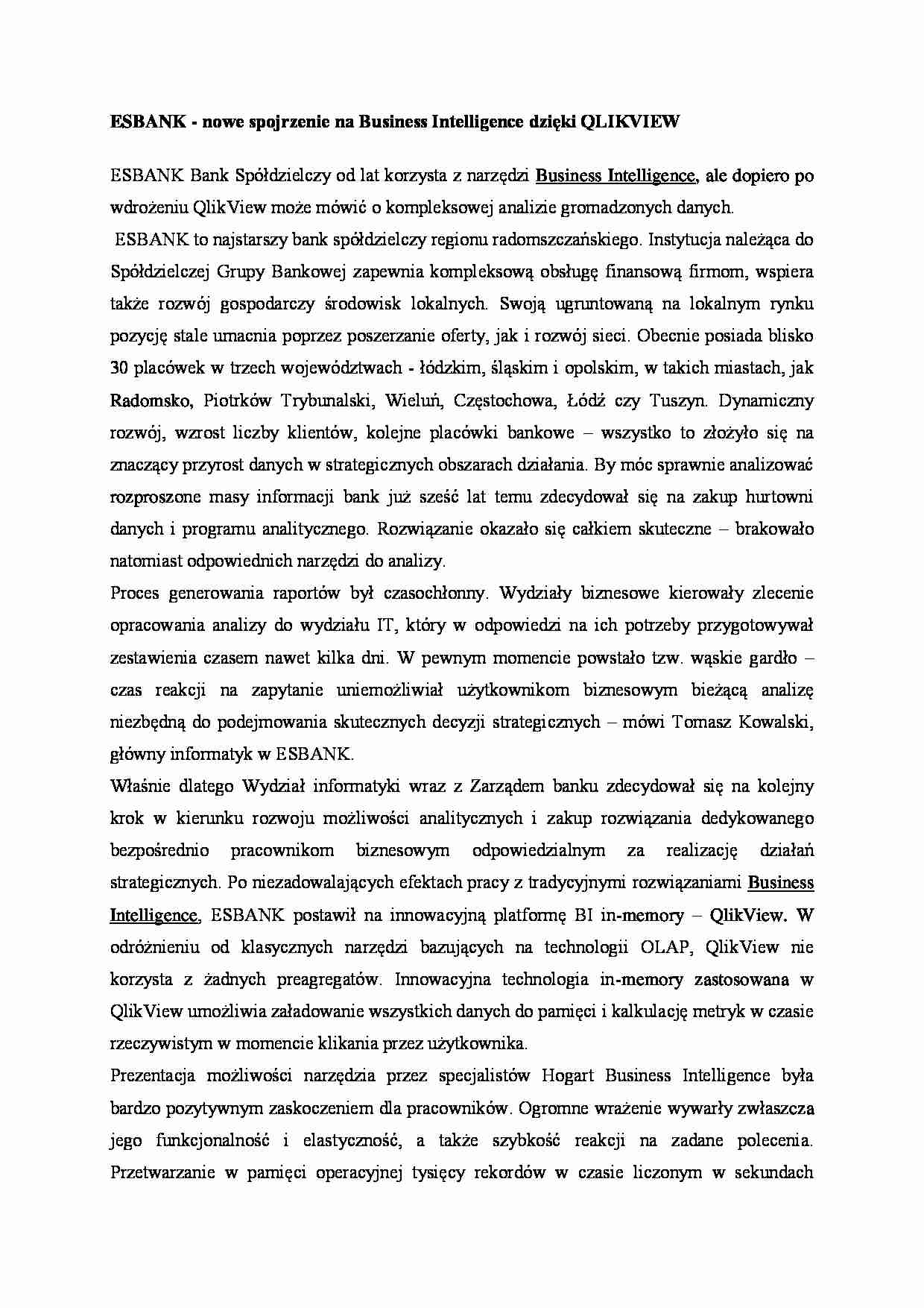 Intelligence, ESBANK postawił na innowacyjną platformę BI in-memory – QlikView. W