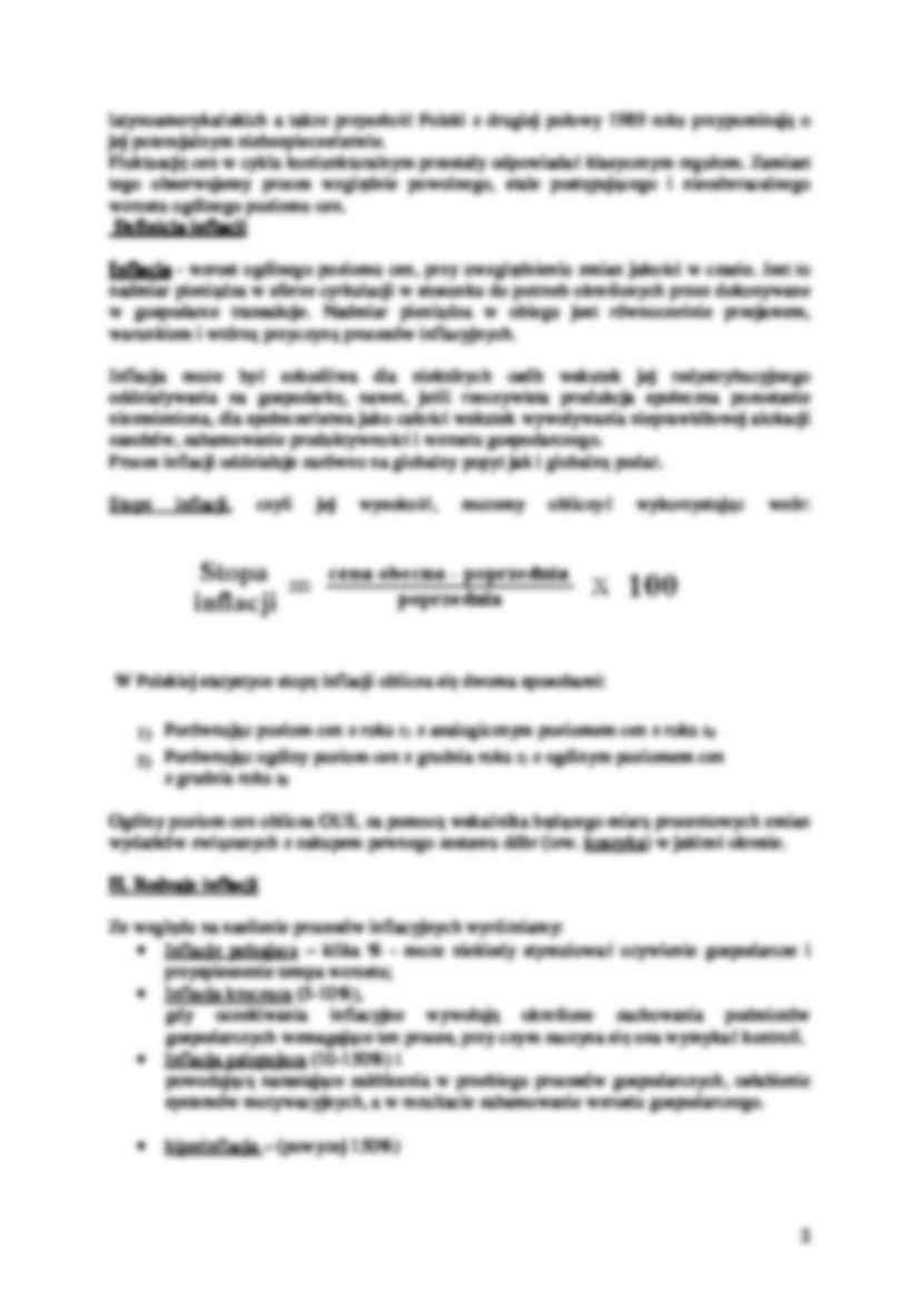 1 VII. Inflacja 1. Pojęcie i typy inflacji. 2. Skutki inflacji. 3. Przyczyny inflacji: luka inflacyjna a teoria popytowa; kosztowa i monetarystyczna teoria inflacji. 4. Przebieg inflacji w Polsce w okresie transformacji. 5. Sposoby przeciwdziałania inflacji. Słowa kluczowe: • poziom cen, • inflacja i deflacja, • wskaźnik cen, • stopa inflacji, • wskaźnik cen dóbr konsumpcyjnych, wskaźnik cen dóbr inwestycyjnych (produkcji sprzedanej przemysłu), deflator PKB, • inflacja pełzająca, umiarkowana i galopująca, • hiperinflacja, • inflacja antycypowana i nieantycypowana, • iluzja pienięŜna, • indeksacja dochodów, • luka inflacyjna, • inflacja popytowa, kosztowa, płacowa i pienięŜna, • inflacja korekcyjna, • polityka antyinflacyjna. W ostatnich latach inflacja stała się najczęściej uŜywanym terminem ekonomicznym w literaturze fachowej i publicystyce. Związane jest to z ogromnym zainteresowaniem społeczeństwa oraz rządu problematyką wzrostu cen. W przeszłości zjawisko masowego wzrostu cen moŜna zaobserwować w okresach wojny lub innych wydarzeń gdy państwa zmuszone były do podejmowania ogromnych wydatków, decydowały się na przejściowe odejścia od waluty złotej i emitowały ogromne ilości pieniądza papierowego, który zalewał rynek wywołując gwałtowną zwyŜkę cen, dezorganizując w efekcie system pienięŜno kredytowy i całą gospodarkę. Z problemem inflacji borykają się lub borykały niemalŜe wszystkie kraje świata. Wzrost cen obserwowano takŜe w warunkach istnienia systemu waluty kruszcowej, a takŜe w okresach oŜywienia koniunktury. RównowaŜony był on odpowiednim spadkiem cen w okresie kryzysu. Mieliśmy więc do czynienia z mechanizmem wahań cyklicznych, w których ceny wykazywały elastyczność w obu kierunkach. W ostatnich dziesięcioleciach skala i charakter problemu uległy zmianom. Kraje wysoko rozwinięte nie przeŜyły w tym okresie klęski hiperinflacji choć doświadczenie krajów 2 latynoamerykańskich a takŜe przyszłość Polski z drugiej połowy 1989 roku przypominają o jej potencjalnym niebezpieczeństwie. Fluktuację cen w cyklu koniunkturalnym przestały odpowiadać klasycznym regułom. Zamiast