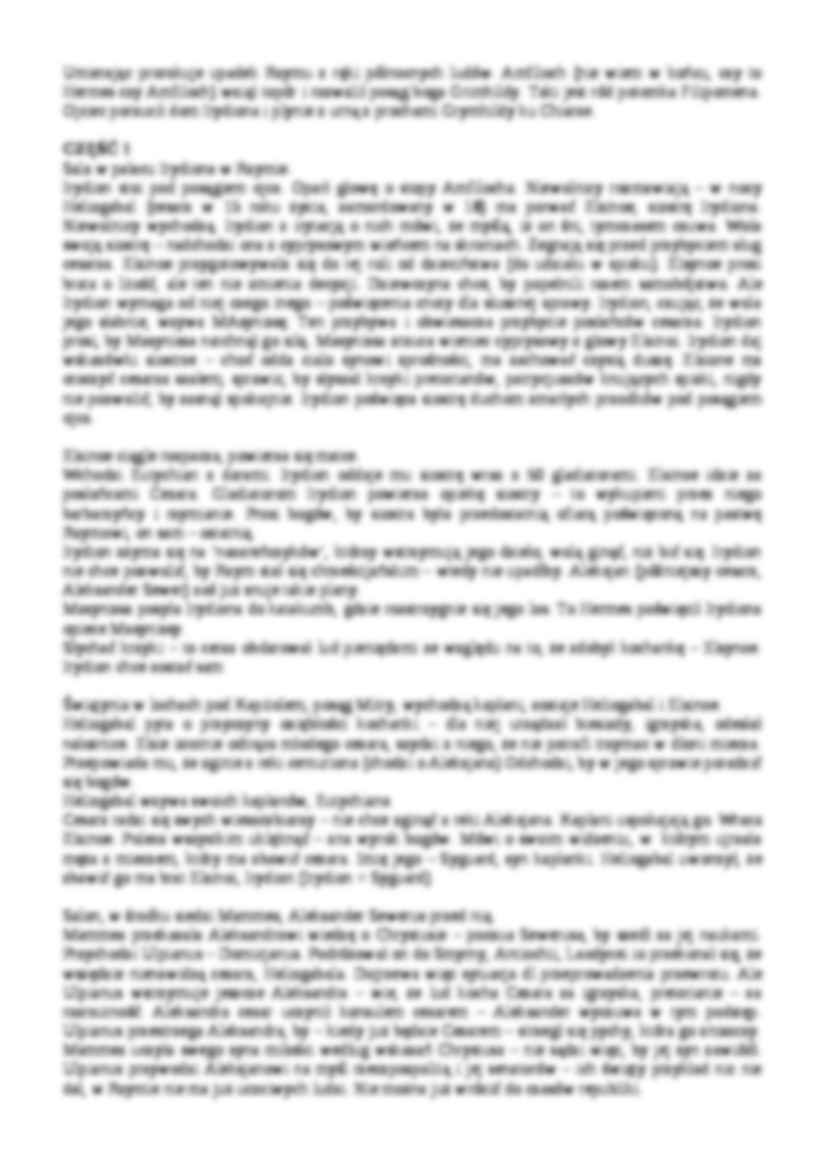 … dl przeprowadzenia przewrotu. Ale Ulpianus wstrzymuje jeszcze Aleksandra - wie, że lud kocha Cezara za igrzyska, pretorianie - za rozrzutność. Aleksandra cezar uczynił konsulem cezarem - Aleksander wyczuwa w tym podstęp. Ulpianus przestrzega Aleksandra, by - kiedy już będzie Cezarem - strzegł się pychy, która go zniszczy. Mammea uczyła swego syna miłości według wskazań Chrystusa - nie sądzi…