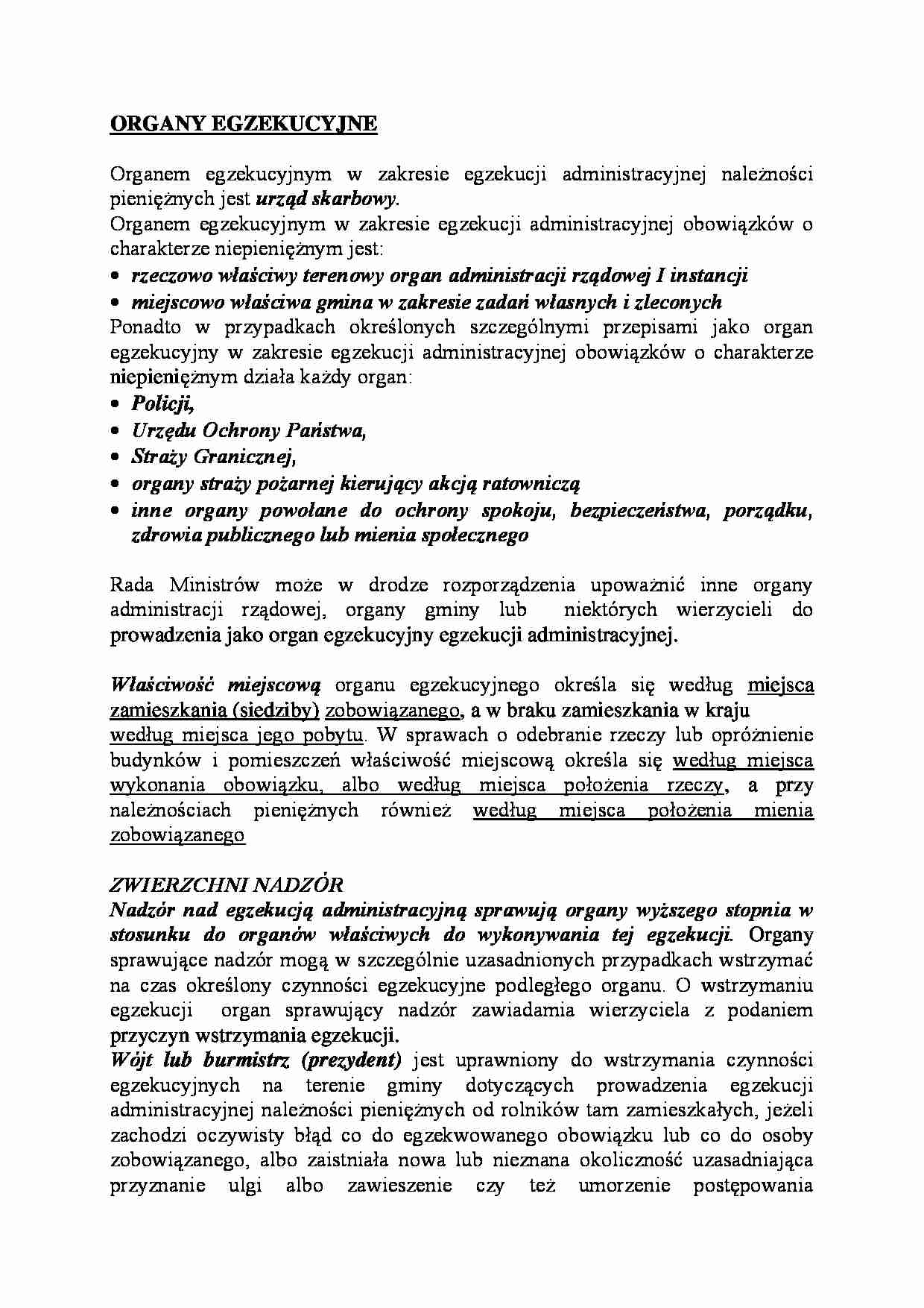 Właściwość miejscową organu egzekucyjnego określa się według miejsca zamieszkania (siedziby) zobowiązanego , a w braku zamieszkania w kraju według miejsca jego pobytu . W sprawach o odebranie rzeczy lub opróżnienie budynków i pomieszczeń właściwość miejscową określa się według miejsca wykonania obowiązku, albo według miejsca położenia rzeczy , a przy należnościach pieniężnych również według miejsca położenia mienia zobowiązanego ZWIERZCHNI NADZÓR Nadzór nad egzekucją administracyjną sprawują organy wyższego stopnia w stosunku do organów właściwych do wykonywania tej egzekucji. Organy sprawujące nadzór mogą w szczególnie uzasadnionych przypadkach wstrzymać na czas określony czynności egzekucyjne podległego organu. O wstrzymaniu egzekucji organ sprawujący nadzór zawiadamia wierzyciela z podaniem przyczyn wstrzymania egzekucji. Wójt lub burmistrz (prezydent) jest uprawniony do wstrzymania czynności egzekucyjnych na terenie gminy dotyczących prowadzenia egzekucji administracyjnej należności pieniężnych od rolników tam zamieszkałych, jeżeli zachodzi oczywisty błąd co do egzekwowanego obowiązku lub co do osoby zobowiązanego, albo zaistniała nowa lub nieznana okoliczność uzasadniająca przyznanie ulgi albo zawieszenie czy też umorzenie postępowania egzekucyjnego. O wstrzymaniu czynności egzekucyjnych wójt lub burmistrz (prezydent) powiadamia niezwłocznie organ egzekucyjny, który postanowi co do dalszego postępowania Zwierzchni nadzór nad czynnościami organów egzekucyjnych w zakresie egzekucji administracyjnej należności pieniężnych sprawuje Minister Finansów . Zwierzchni nadzór nad czynnościami organów egzekucyjnych w zakresie egzekucji administracyjnej obowiązków o charakterze niepieniężnym sprawują właściwe dla tych organów