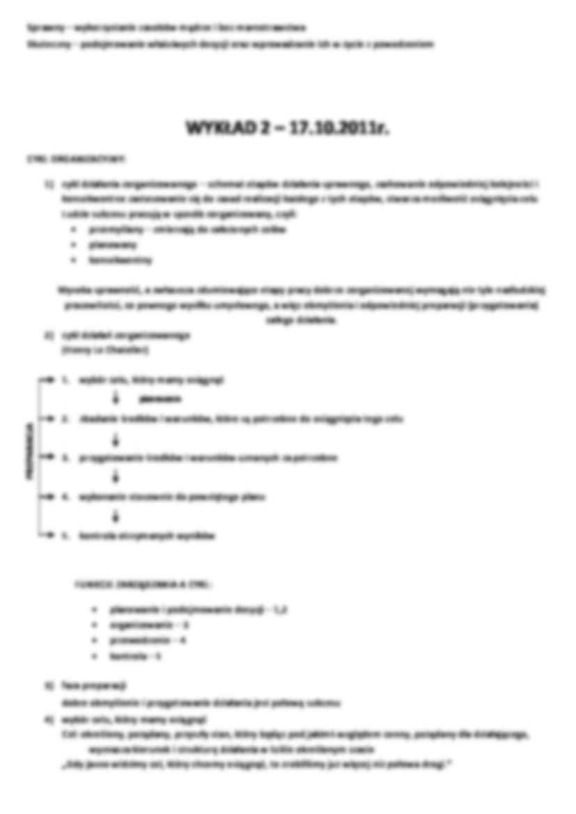 Informacje zawarte w notatce to: organizacja, zasoby organizacji, funkcje zarządzania, sprzężenie zwrotne, organizacja i jej otoczenie, przeszkody utrudniające proces planowania, racjonalny model podejmowania decyzji.
