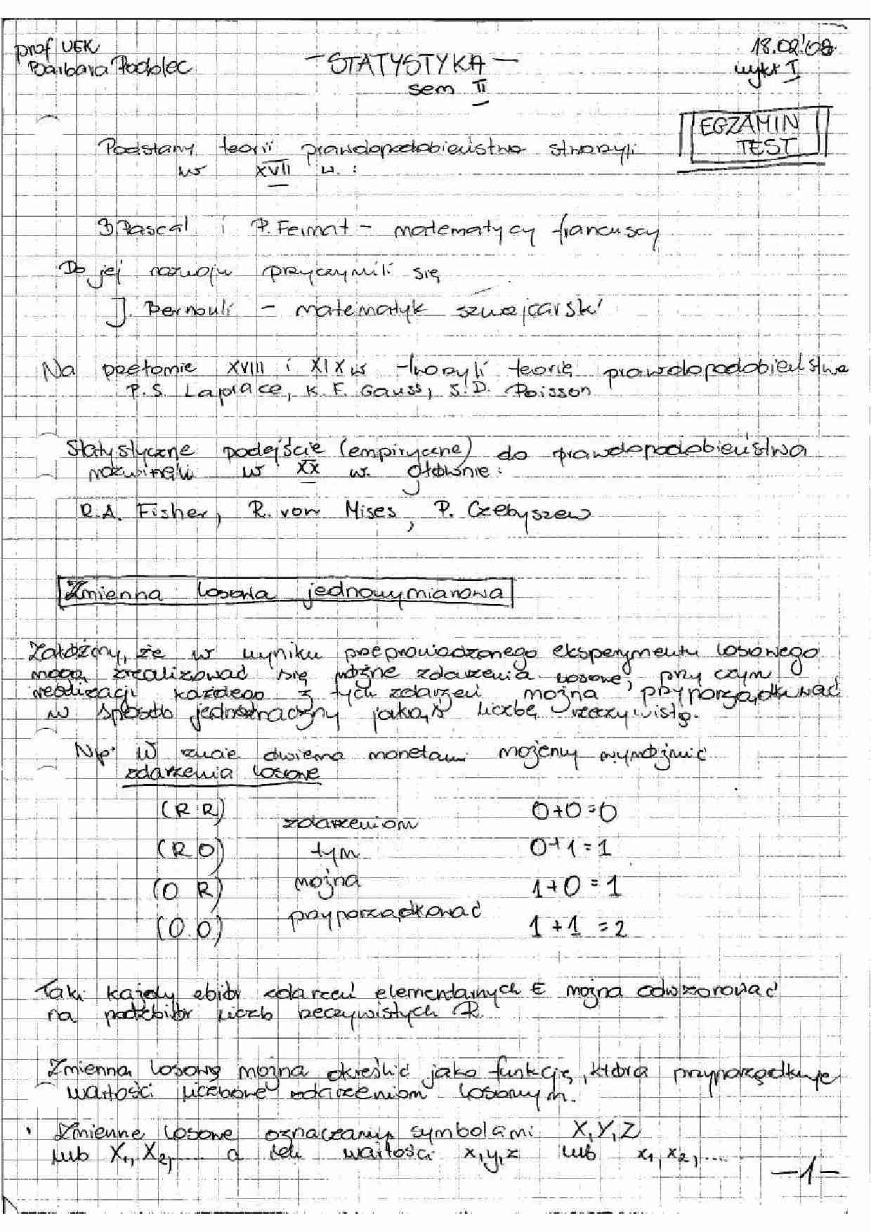 Przedmiot prowadzi prof. dr hab. Barbara Podolec. Dokument ma 27 stron i jest w formie skanów czytelnych notatek odręcznych. Notatka porusza zagadnienia takie jak: zmienna losowa jednowymiarowa, zmienna losowa typu skokowego, funkcja prawdopodobieństwa zmiennej losowej, dystrybuanta, średnia arytmetyczna, wartość oczekiwana, moment zwykły, moment centralny, wariancja, odchylenie standardowe, własności wartości oczekiwanej, rozkład dwumianowy, rozkład dwuparametryczny, rozkład Poissona, rozkład hipergeometryczny, rozkłady zmiennej losowej ciągłej, wykres funkcji gęstości, wykres dystrybuanty, rozkład normalny, Gauss, standaryzacja, statystyka matematyczna, metoda estymacji, metoda weryfikacji, próba losowa, twierdzenie Gliwienki, estymacja, estymator, estymacja przedziałowa, przedział ufności, efekt estymacji przedziałowej, parametr, ocena parametru, estymacja punktowa, własności estymatorów, prawo wielkich liczb, estymacja wartości oczekiwanej, rozkład Studenta, estymacja wariancji, przedział ufności, frakcja, weryfikacja hipotez statystycznych, test statystyczny, statystyczne testy istotności, obszar krytyczny, testy podwójne, test dla dwóch średnich, test dla dwóch wariancji, statystyka F Snedecora, testy w analizie współzależności.