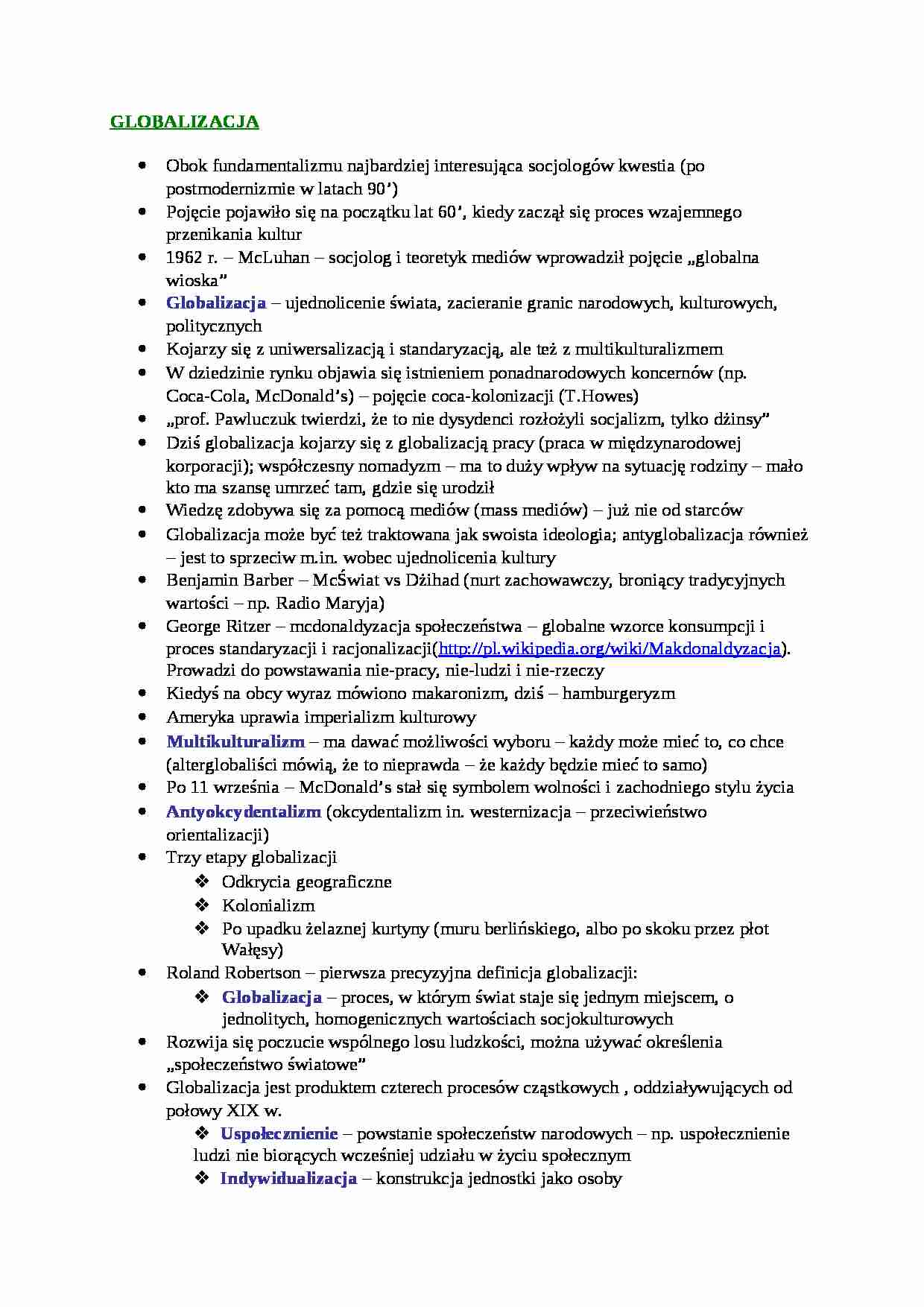 Globalizacja - proces, w którym świat staje się jednym miejscem, o jednolitych, homogenicznych wartościach socjokulturowych