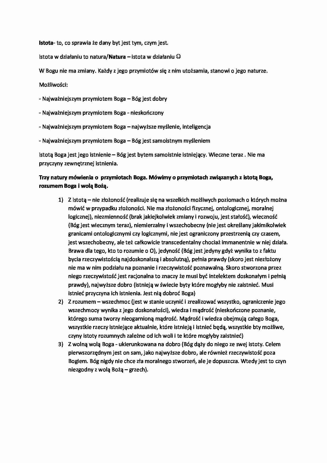 Z Istotą - nie złożoność (realizuje się na wszelkich możliwych poziomach o których można mówić w przypadku złożoności. Nie ma złożoności fizycznej, ontologicznej, moralnej logicznej), niezmienność (brak jakiejkolwiek zmiany i rozwoju, jest stałość), wieczność (Bóg jest wiecznym teraz), niemierzalny i wszechobecny (nie jest określany jakimikolwiek granicami ontologicznymi czy logicznymi, nie jest ograniczony przestrzenią czy czasem, jest wszechobecny, ale też całkowicie transcedentalny chociaż immanentnie w niej działa. Brawa dla tego, kto to rozumie o O), jedyność (Bóg jest jedyny gdyż wynika to z faktu bycia rzeczywistością najdoskonalszą i absolutną), pełnia prawdy (skoro jest niezłożony nie ma w nim podziału na poznanie i rzeczywistość poznawalną. Skoro stworzona przez niego rzeczywistość jest racjonalna to znaczy że musi być intelektem doskonałym i pełnią prawdy), najwyższe dobro (istnieją w świecie byty które mogłyby nie zaistnieć. Musi istnieć przyczyna ich istnienia. Jest nią dobroć Boga)