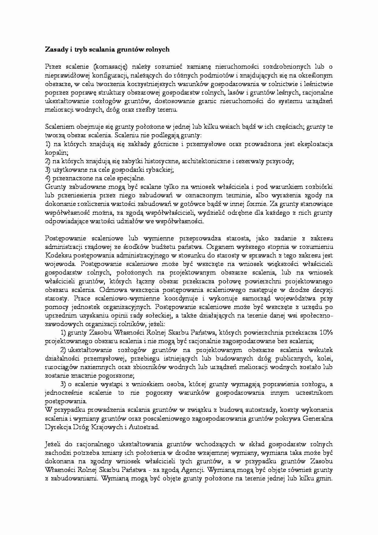 Scaleniem obejmuje się grunty położone w jednej lub kilku wsiach bądź w ich częściach; grunty te tworzą obszar scalenia. Scaleniu nie podlegają grunty: 1) na których znajdują się zakłady górnicze i przemysłowe oraz prowadzona jest eksploatacja kopalin; 2) na których znajdują się zabytki historyczne, architektoniczne i rezerwaty przyrody; 3) użytkowane na cele gospodarki rybackiej; 4) przeznaczone na cele specjalne. Grunty zabudowane mogą być scalane tylko na wniosek właściciela i pod warunkiem rozbiórki lub przeniesienia przez niego zabudowań w oznaczonym terminie, albo wyrażenia zgody na dokonanie rozliczenia wartości zabudowań w gotówce bądź w innej formie. Za grunty stanowiące współwłasność można, za zgodą współwłaścicieli, wydzielić odrębne dla każdego z nich grunty odpowiadające wartości udziałów we współwłasności. Postępowanie scaleniowe lub wymienne przeprowadza starosta, jako zadanie z zakresu administracji rządowej ze środków budżetu państwa. Organem wyższego stopnia w rozumieniu Kodeksu postępowania administracyjnego w stosunku do starosty w sprawach z tego zakresu jest wojewoda. Postępowanie scaleniowe może być wszczęte na wniosek większości właścicieli gospodarstw rolnych, położonych na projektowanym obszarze scalenia, lub na wniosek właścicieli gruntów, których łączny obszar przekracza połowę powierzchni projektowanego obszaru scalenia. Odmowa wszczęcia postępowania scaleniowego następuje w drodze decyzji starosty. Prace scaleniowo-wymienne koordynuje i wykonuje samorząd województwa przy pomocy jednostek organizacyjnych. Postępowanie scaleniowe może być wszczęte z urzędu po uprzednim uzyskaniu opinii rady sołeckiej, a także działających na terenie danej wsi społeczno-zawodowych organizacji rolników, jeżeli: 1) grunty Zasobu Własności Rolnej Skarbu Państwa, których powierzchnia przekracza 10% projektowanego obszaru scalenia i nie mogą być racjonalnie zagospodarowane bez scalenia;