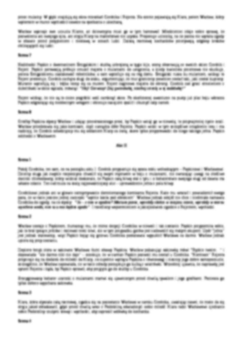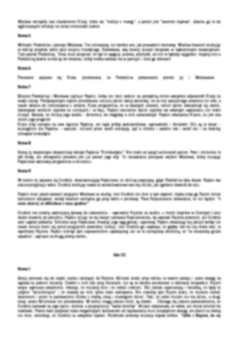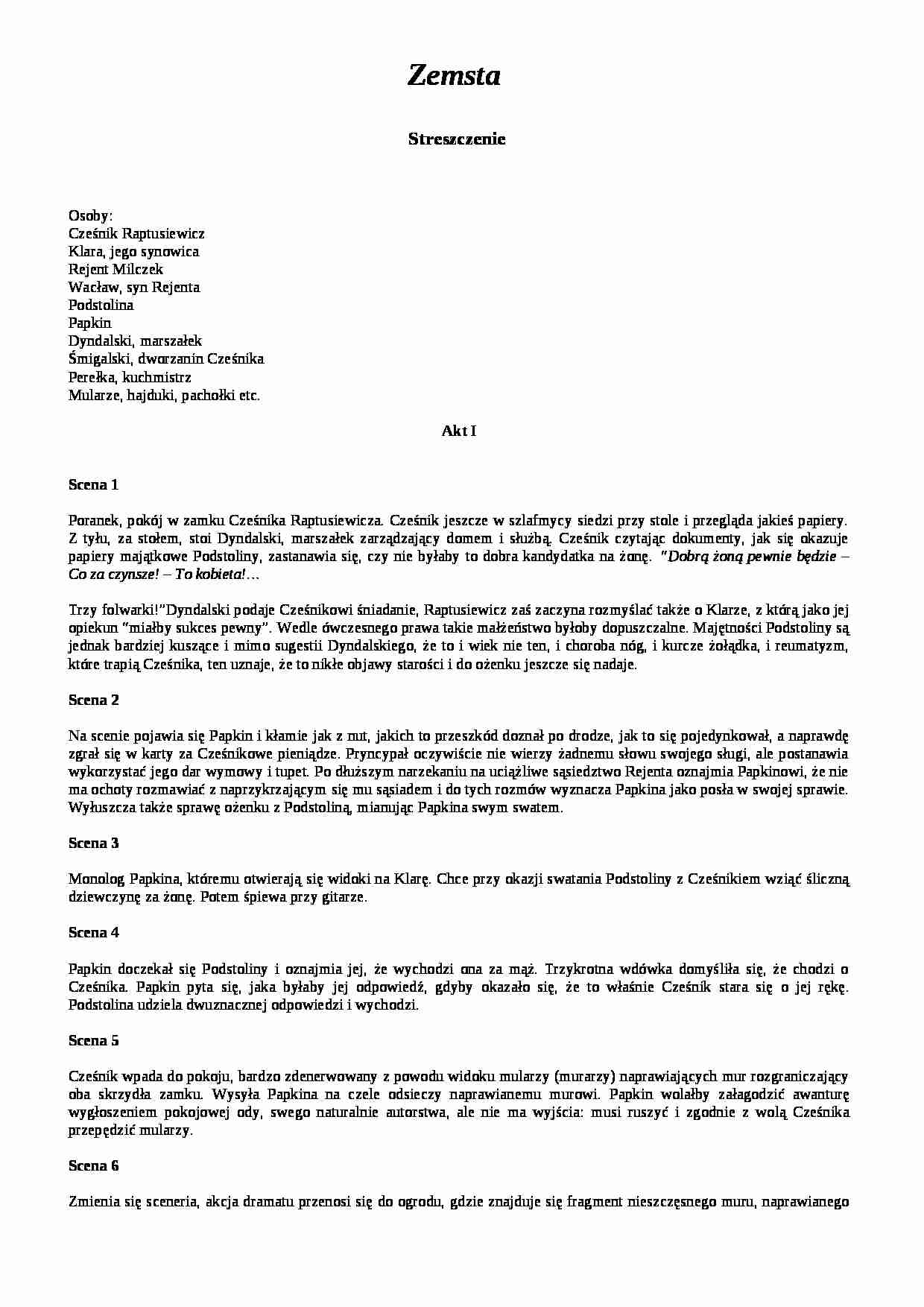 Zemsta Streszczenie Osoby: Cześnik Raptusiewicz Klara, jego synowica Rejent Milczek Wacław, syn Rejenta Podstolina Papkin Dyndalski, marszałek Śmigalski, dworzanin Cześnika Perełka, kuchmistrz Mularze, hajduki, pachołki etc. Akt I Scena 1 Poranek, pokój w zamku Cześnika Raptusiewicza. Cześnik jeszcze w szlafmycy siedzi przy stole i przegląda jakieś papiery. Z tyłu, za stołem, stoi Dyndalski, marszałek zarządzający domem i służbą. Cześnik czytając dokumenty, jak się okazuje papiery majątkowe Podstoliny, zastanawia się, czy nie byłaby to dobra kandydatka na żonę. “Dobrą żoną pewnie będzie - Co za czynsze! - To kobieta!… Trzy folwarki!”Dyndalski podaje Cześnikowi śniadanie, Raptusiewicz zaś zaczyna rozmyślać także o Klarze, z którą jako jej opiekun “miałby sukces pewny”. Wedle ówczesnego prawa takie małżeństwo byłoby dopuszczalne. Majętności Podstoliny są jednak bardziej kuszące i mimo sugestii Dyndalskiego, że to i wiek nie ten, i choroba nóg, i kurcze żołądka, i reumatyzm, które trapią Cześnika, ten uznaje, że to nikłe objawy starości i do ożenku jeszcze się nadaje. Scena 2 Na scenie pojawia się Papkin i kłamie jak z nut, jakich to przeszkód doznał po drodze, jak to się pojedynkował, a naprawdę zgrał się w karty za Cześnikowe pieniądze. Pryncypał oczywiście nie wierzy żadnemu słowu swojego sługi, ale postanawia wykorzystać jego dar wymowy i tupet. Po dłuższym narzekaniu na uciążliwe sąsiedztwo Rejenta oznajmia Papkinowi, że nie ma ochoty rozmawiać z naprzykrzającym się mu sąsiadem i do tych rozmów wyznacza Papkina jako posła w swojej sprawie. Wyłuszcza także sprawę ożenku z Podstoliną, mianując Papkina swym swatem.